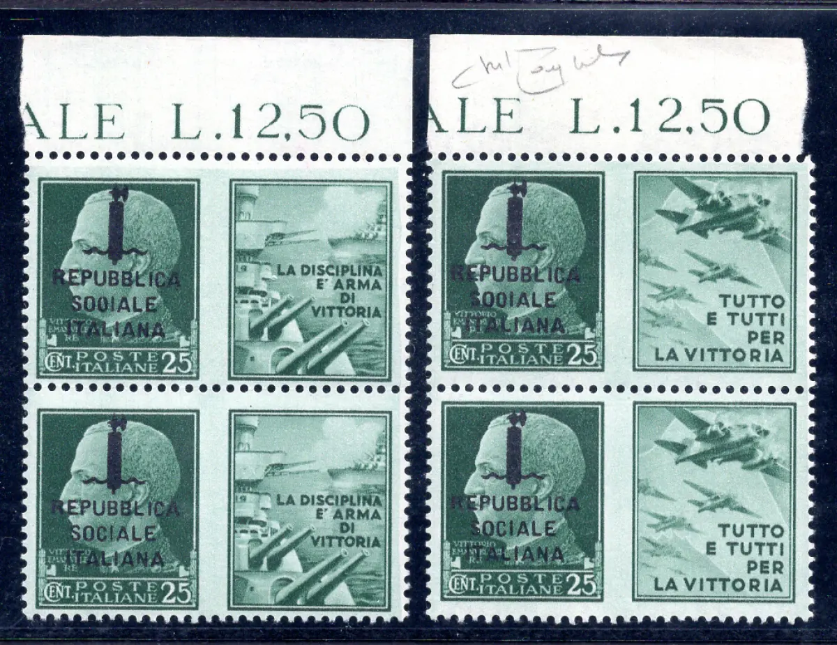 MNH - VOLLGUMMI - Kriegspropaganda Cent. 25 n. 25k und 27k zwei Werte im vertikalen Drehmoment Blattrand, das obere Exemplar mit Tippfehler Sooiale neu perfekter Vollgummi - Schönes Euro-Katalog-Set? Cod.2400/WEB