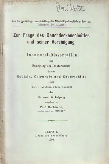 Kschischo, Paul: Zur Frage des Bauchdeckenschnittes und seiner Vereinigung. Dissertation an der Universität Leipzig, 1903. Aus der gynäkologischen Abteilung des Allerheiligenhospitals zu Breslau.