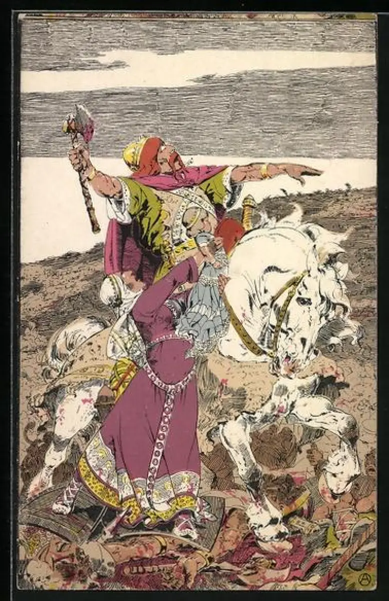 Künstler-AK A. Ost: Krieger und Frau mit Kind auf einem Schlachtfeld