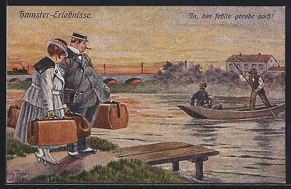 Künstler-AK A. Thiele: Dickliches Paar wartet am Wasser aufs Fährenboot, Spruch