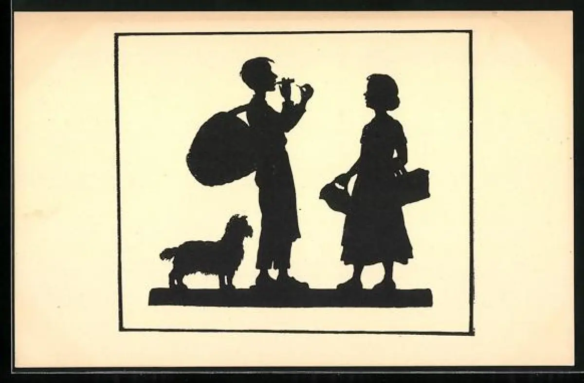 Künstler-AK Anna Schirmer: Silhouette, Mann mit Hund geht auf Wanderschaft