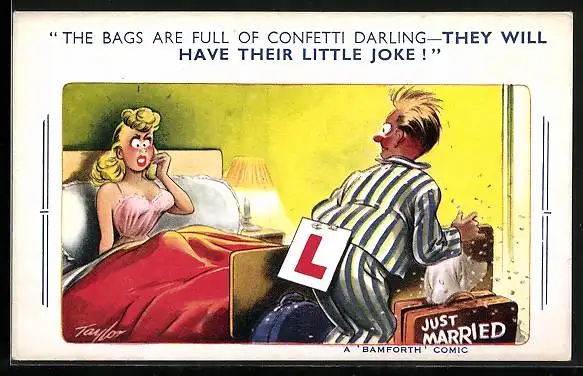 Künstler-AK Arnold Taylor: Frau sitzt im Bett, Mann mit Koffern, Just Married