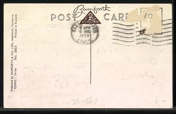 alte Ansichtskarte, gelaufen 1955, Briefmarke entfernt, rückseitig Oberflächenschaden, Stempelspur, guter Zustand