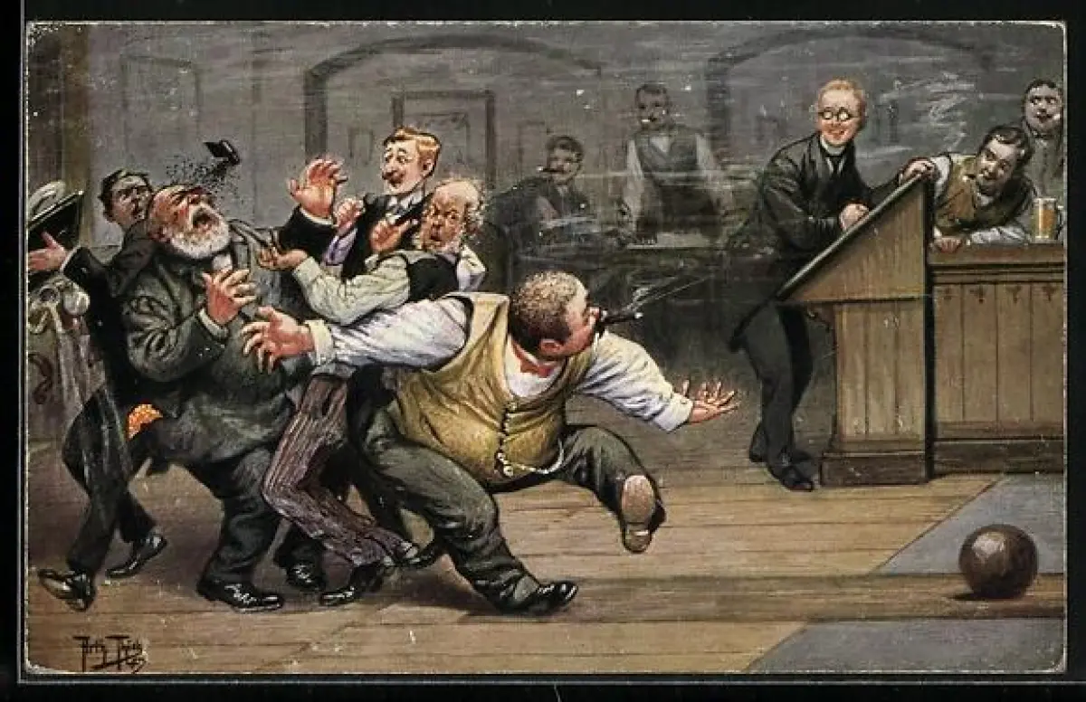 Künstler-AK Arthur Thiele: Betrunkene Kegelspieler auf der Kegelbahn