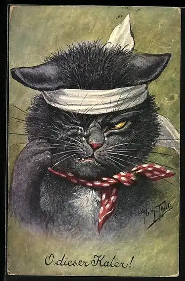 Künstler-AK Arthur Thiele: Schwarzer Kater nach einem Kampf