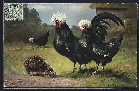Künstler-AK August Müller - München: Hennen mit einem Igel