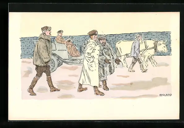 Künstler-AK Auto mit Panne wird von einem Rindergespann abgeschleppt