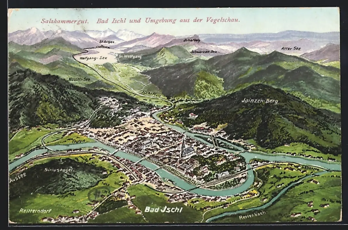 Künstler-AK Bad Ischl /Salzkammergut, Ortsansicht mit Rettenbach, Siriuskogel und Jainzen-Berg aus der Vogelschau