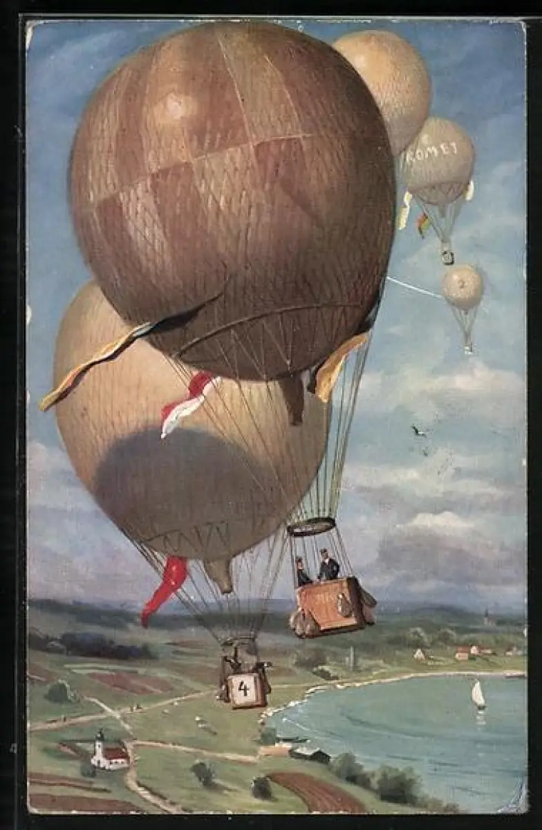 Künstler-AK Ballons bei einem Wettflug über einem See
