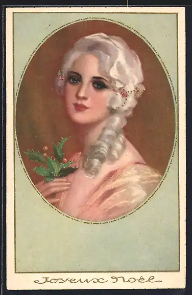 Künstler-AK Barocker Weihnachtsgruss, Hübsche Dame mit gepuderter Perücke, Art Deco