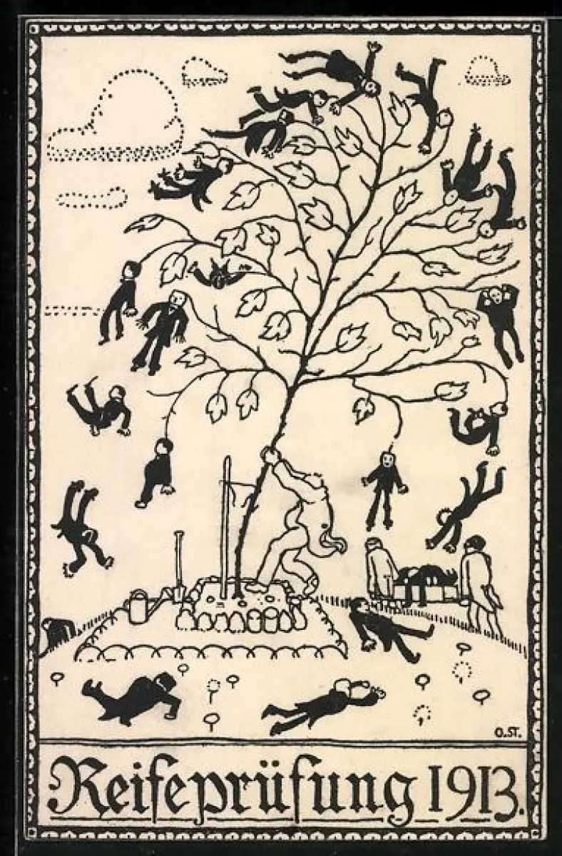 Künstler-AK Basel, 5c Obere Realschule, Reifeprüfung 1913, Schüler fallen aus einem Baum