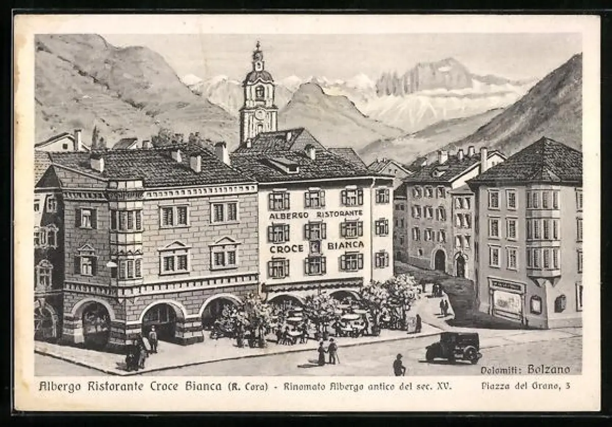 Künstler-AK Bolzano, Albergo Ristorante Croce Bianca, Piazza del Grano, 3