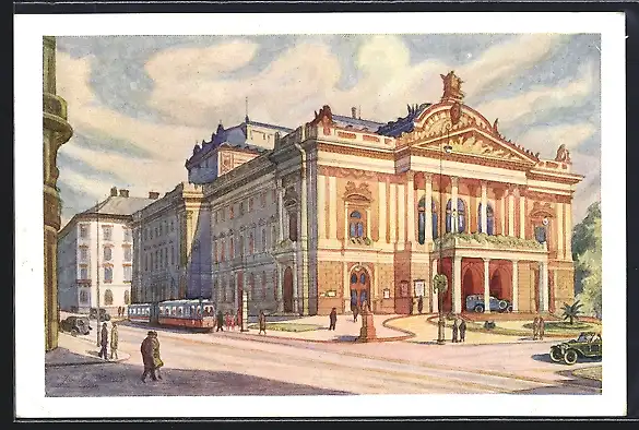 Künstler-AK Brno, Narodni divadlo, Janackova opera, Strassenbahn