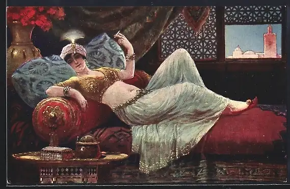 Künstler-AK Camil Vladislav Muttich: Im Harem, Bauchtänzerin räkelt sich rauchend auf Diwan