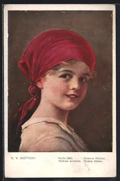 Künstler-AK Camil Vladislav Muttich: Unsere Kinder, Mädchen mit rotem Kopftuch