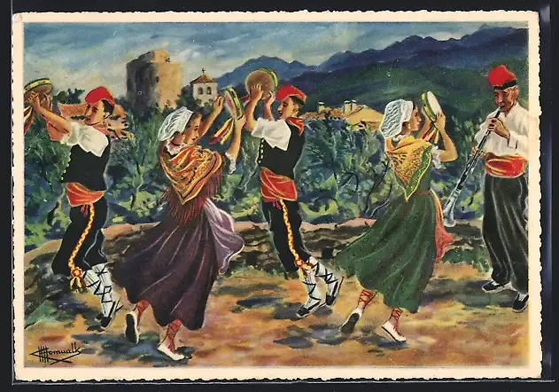 Künstler-AK Charles Homualk: Katallanischer Volkstanz L`Entrellacade