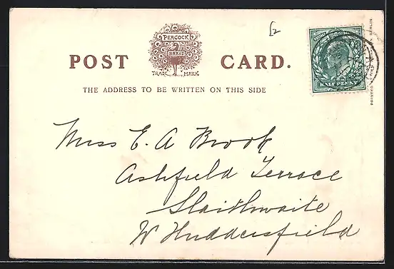 Personenbezogene Daten auf der Rückseite der Karte wurden durch blauen Textmarker unkenntlich gemacht. Die blauen Stellen sind auf die Vorderseite durchgeweicht und wirken sich negativ auf das Postkartenfoto aus
