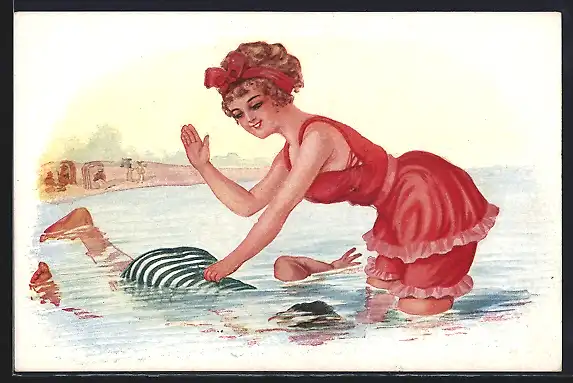 Künstler-AK Dame in Bademode taucht Mann unters Wasser