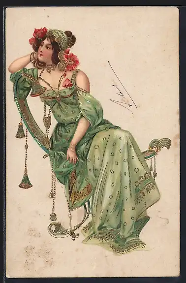 Künstler-AK Dame in orientalischer Mode mit Blumen im Haar, Jugendstil