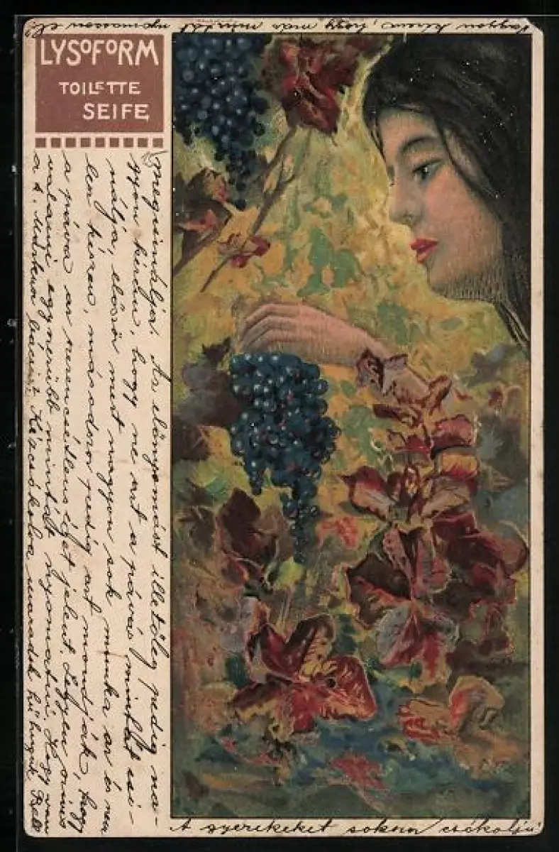 Künstler-AK Dame pflückt Weintrauben, Reklame für Seife der Firma Lysoform, Jugendstil