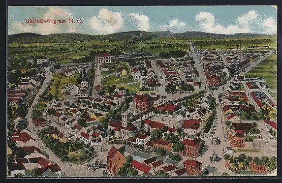 Künstler-AK Deutsch-Wagram /N. Ö., Schematisierte Gesamtansicht mit Strassen und Bergpanorama aus der Vogelschau