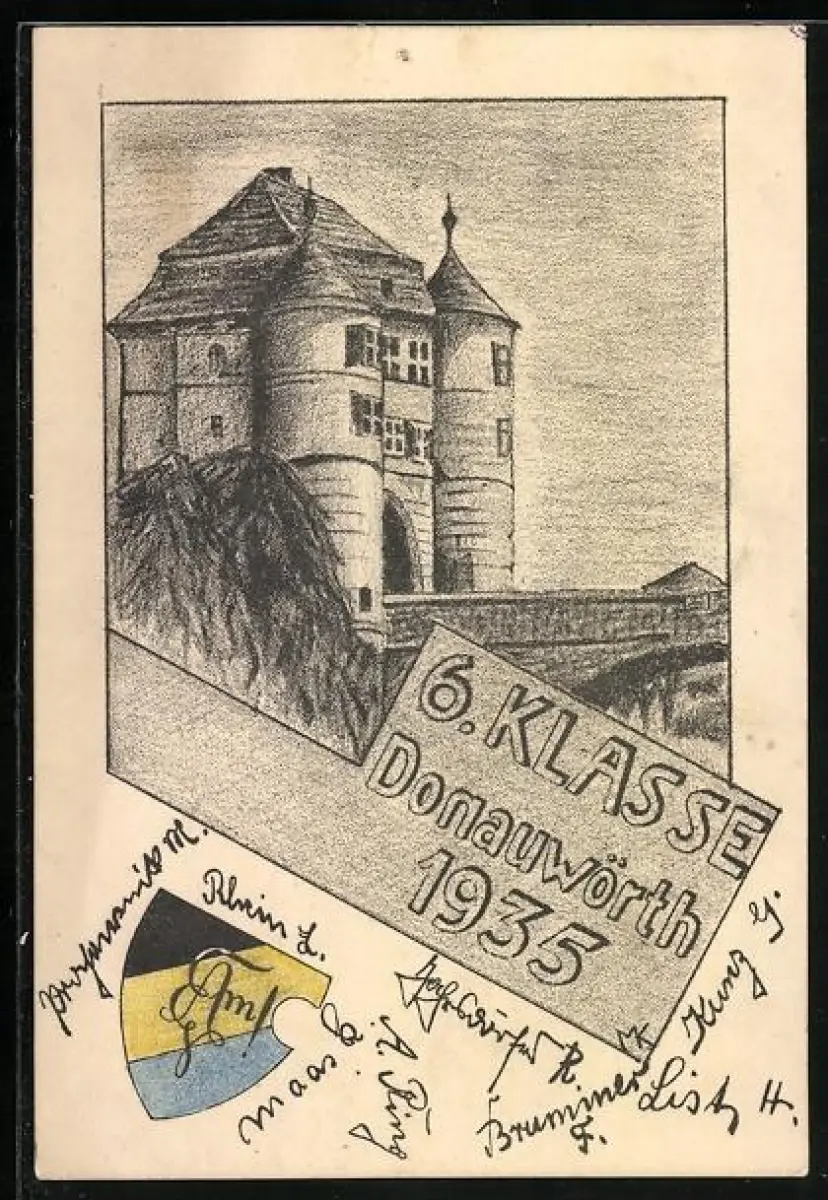 Künstler-AK Donauwörth, Absolvia 6. Klasse 1935, Studentenwappen, Ortsansicht