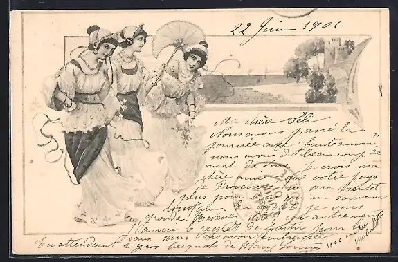 Künstler-AK Drei Frauen mit Kopfbedeckungen und Fächer, Jugendstil