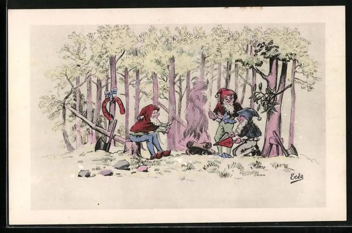 Künstler-AK Drei Zwerge machen ein Feuer im Wald