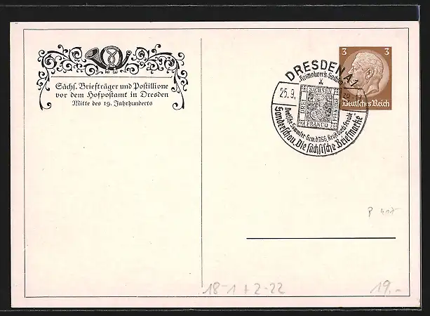 Künstler-AK Dresden, Sächs. Briefträger und Postillione vor dem Hofpostamt Mitte des 19. Jahrhunderts, Ganzsache
