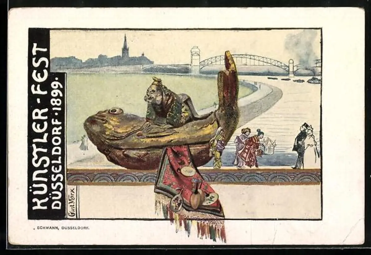 Künstler-AK Düsseldorf, Künstler-Fest 1899, Statue eines Fisches m. Mann und Geishas