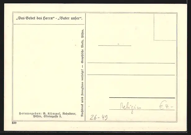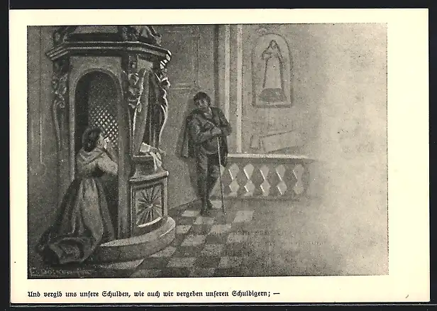 Künstler-AK E. Döcker: Und vergib uns unsere Schulden..., Frau im Beichtstuhl
