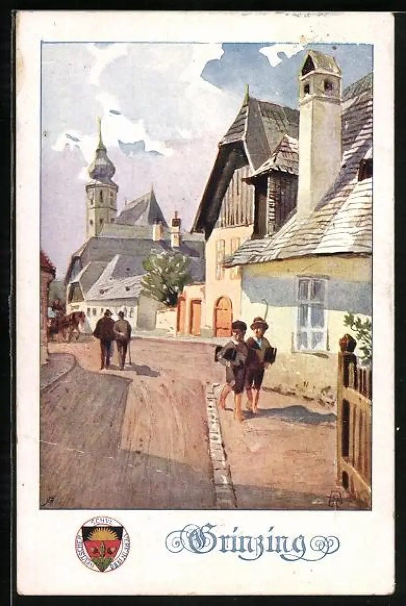 Künstler-AK E.Reckziegel: Grinzing, Ortspartie mit Leuten und Kirche, Deutscher Schulverein
