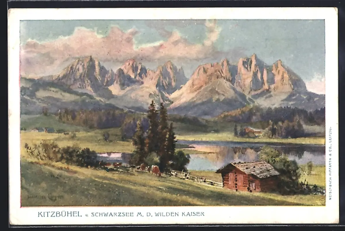 Künstler-AK Edward Harrison Compton: Kitzbühel, Schwarzsee mit wildem Kaiser