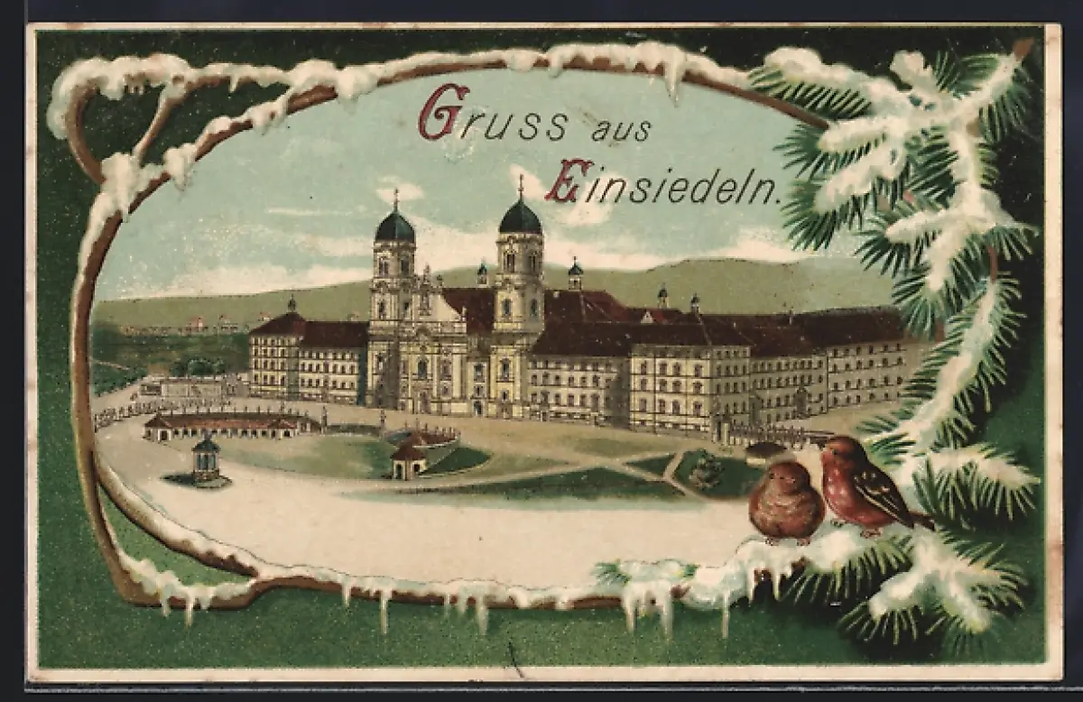 Künstler-AK Einsiedeln, Kloster mit Strassenpartie, Tannenzweig mit Vögeln im Winter, Passepartout