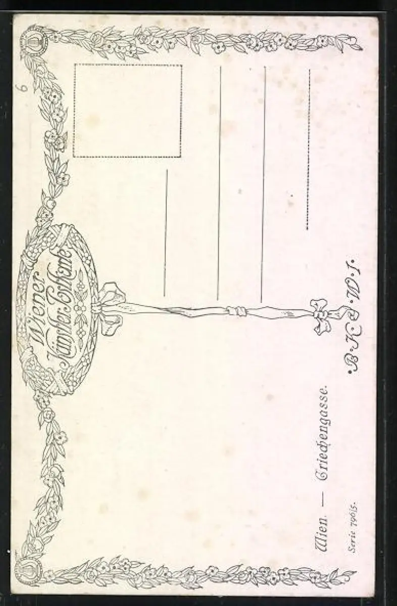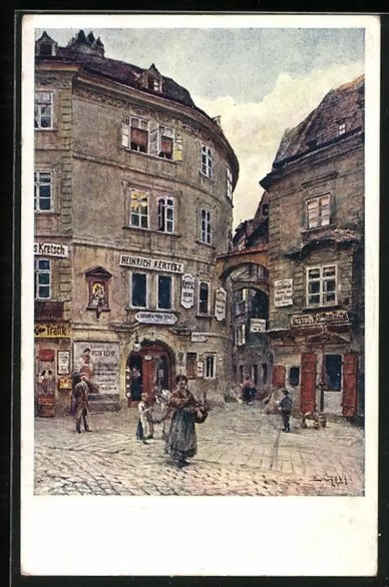 Künstler-AK Emil Czech: Wien, Griechengasse mit Weinhandlung von Heinrich Kertesz, Frau mit Korb