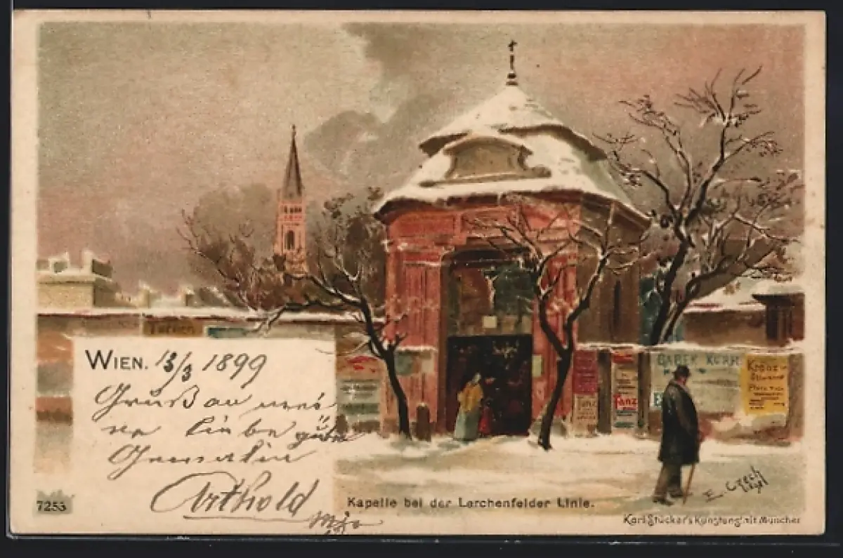Künstler-AK Emil Czech: Wien VIII, Kapelle bei der Lerchenfelder Linie, Leute