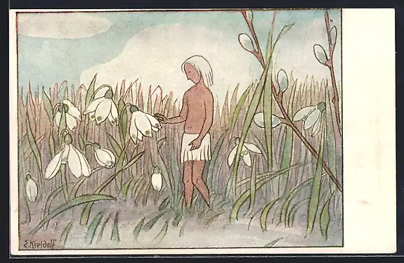 Künstler-AK Ernst Kreidolf: Kind mit weissem Haar neben den Schneeglöckchen stehend