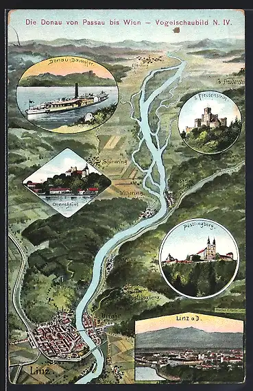 Künstler-AK Eugen Felle: Linz a. Donau, Die Donau von Passau bis Wien, Vogelschaubild, Linz, Pöstlingberg