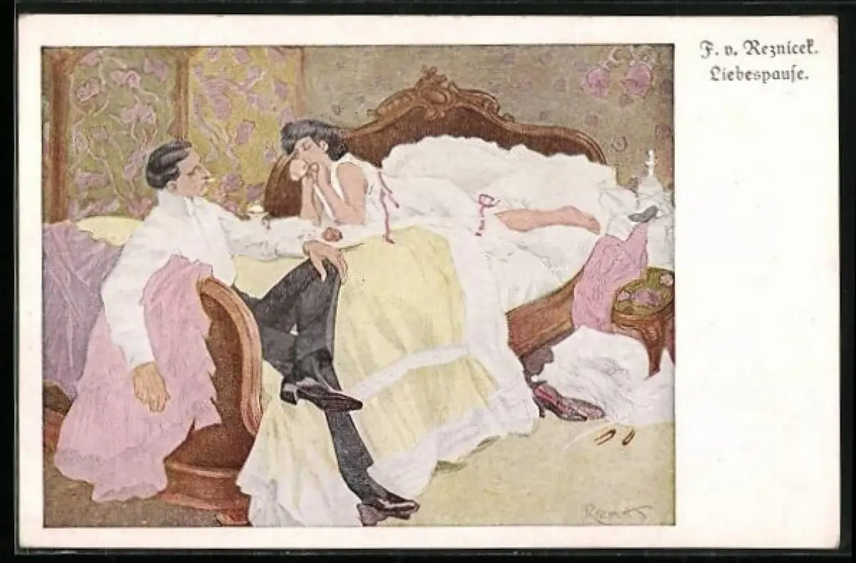 Künstler-AK Ferdinand von Reznicek: Paar auf dem Bett, die Frau leicht bekleidet, Liebespause