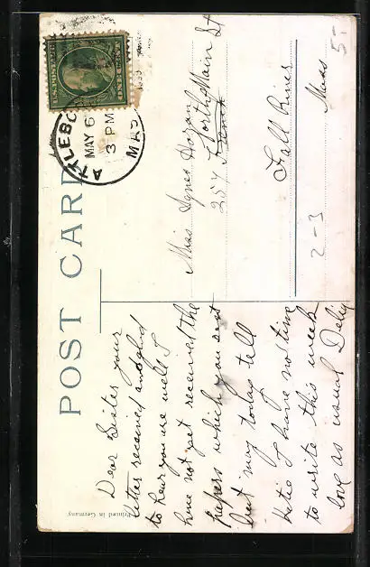 Personenbezogene Daten auf der Rückseite der Karte wurden durch blauen Textmarker unkenntlich gemacht. Die blauen Stellen sind auf die Vorderseite durchgeweicht und wirken sich negativ auf das Postkartenfoto aus