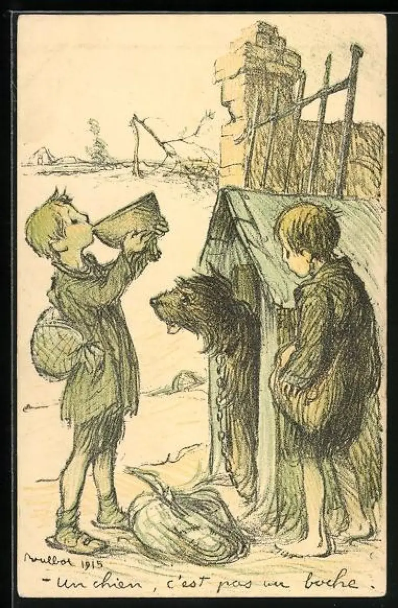 Künstler-AK Francisque Poulbot: Un chien, c`est pas un boche, Jungs trinken aus dem Hundenapf