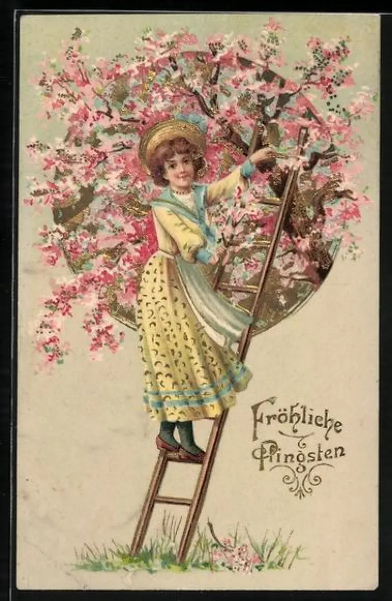 Künstler-AK Frau auf einer Leiter pflückt Blüten, Fröhliche Pfingsten