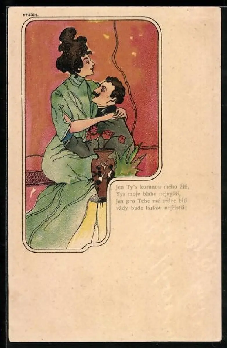 Künstler-AK Frau mit Hochsteckfrisur sitzt auf dem Schoss eines Mannes, Jugendstil