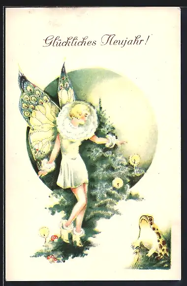 Künstler-AK Frau mit Schmetterlingsflügeln und ein Frosch, Neujahrsgruss