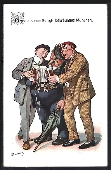 Künstler-AK Fritz Quidenus: Gruss aus dem Königl. Hofbräuhaus München, Drei Herren in Bierlaune