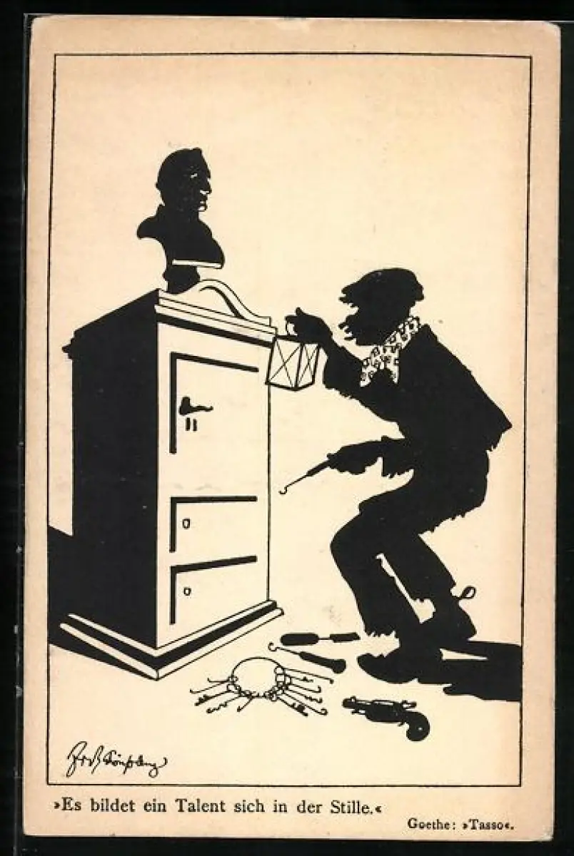 Künstler-AK Fritz Schönpflug: Es bildet ein Talent sich in der Stille - Einbrecher bei der Arbeit, Scherenschnitt