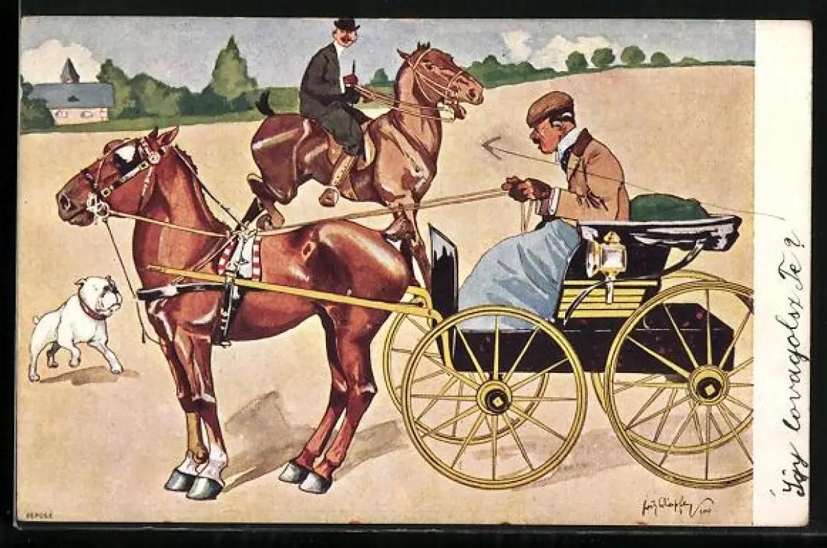 Künstler-AK Fritz Schönpflug: Pferd des Kutschers scheut vor weisser Bulldoge