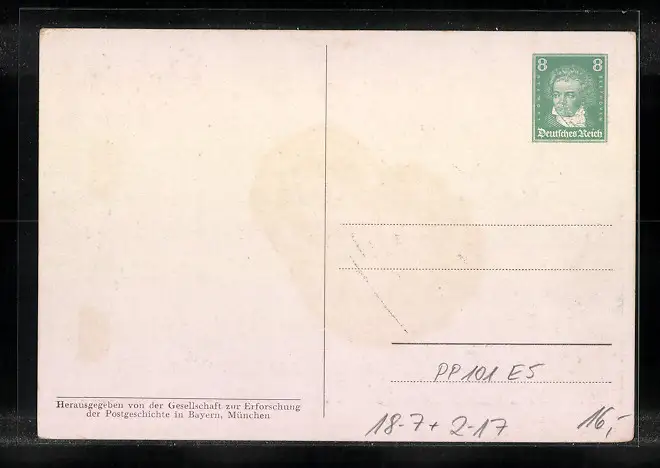 Personenbezogene Daten auf der Rückseite der Karte wurden durch blauen Textmarker unkenntlich gemacht. Die blauen Stellen sind auf die Vorderseite durchgeweicht und wirken sich negativ auf das Postkartenfoto aus