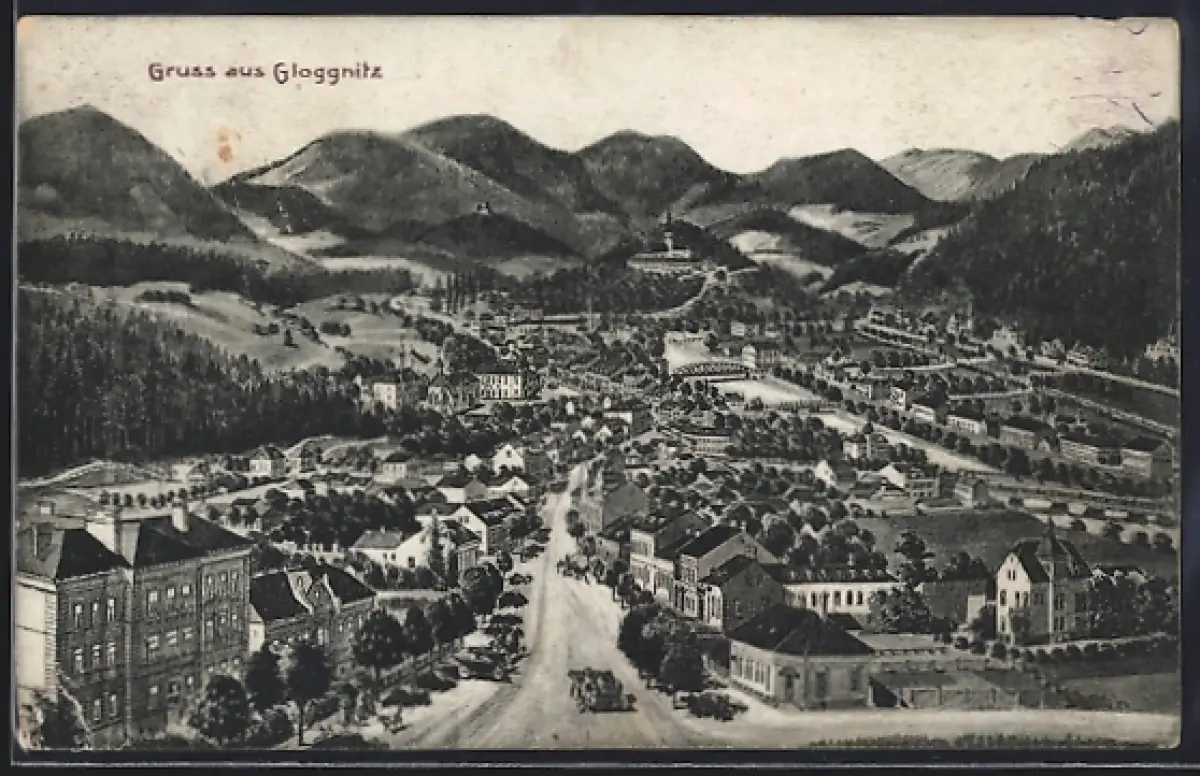 Künstler-AK Gloggnitz, Teilansicht mit Strassenpartie