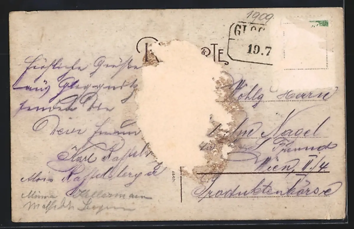 alte Ansichtskarte, gelaufen, Briefmarke entfernt, rückseitig Oberflächenschaden, rückseitig Klebe- und Papierreste, guter Zustand